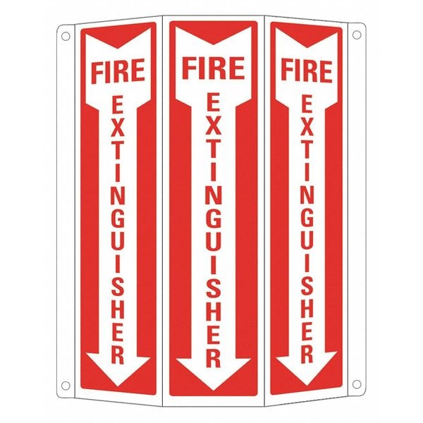 Safety Sign, Tri-Bend, Number of Printed Sides 1, English, Sign Legend Fire Extinguisher, Sign Legend Background Color Red, White, Sign Legend Style Symbol and Text