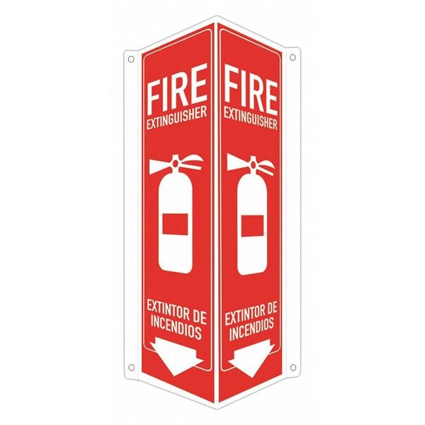 Safety Sign, V-Shape Projection, Number of Printed Sides 1, English, Spanish, Sign Legend Fire Extinguisher/Extintor De Incendios, Sign Legend Background Color Red, Sign Legend Style Symbol and Text