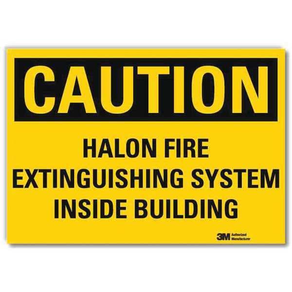 Safety Sign, Horizontal Rectangle, Number of Printed Sides 1, English, Sign Format Traditional OSHA, Sign Legend Halon Fire Extinguishing System Inside Building, Sign Legend Background Color Yellow, Sign Legend Style Text