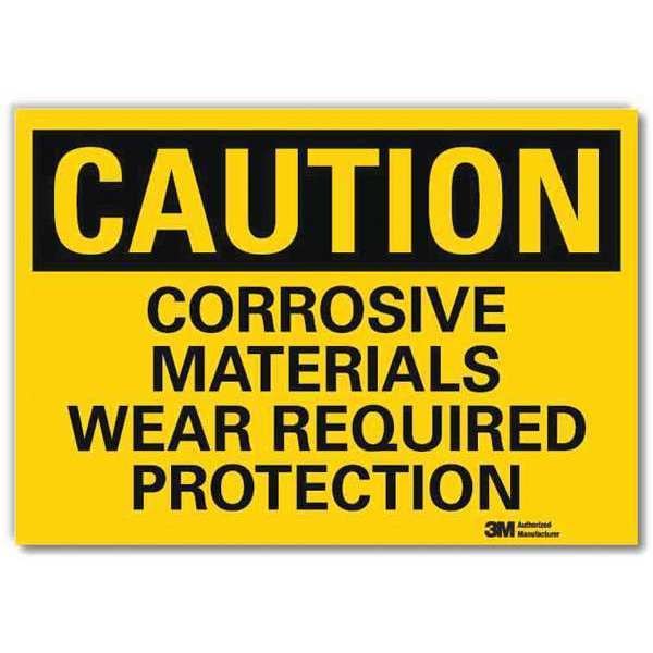 Safety Sign, Horizontal Rectangle, Number of Printed Sides 1, English, Sign Format Traditional OSHA, Sign Legend Corrosive Materials Wear Required Protection, Sign Legend Background Color Yellow, Sign Legend Style Text