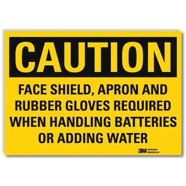 Safety Sign, Vertical Rectangle, Number of Printed Sides 1, English, Sign Format Traditional OSHA, Sign Legend Face Shield, Apron And Rubber Gloves Required When Handling Batteries Or Adding Water, Sign Legend Background Color Yellow, Sign Legend Style Text