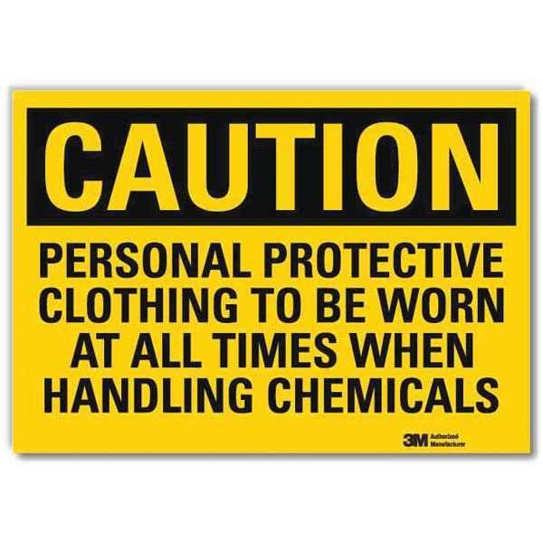 Safety Sign, Horizontal Rectangle, Number of Printed Sides 1, English, Sign Format Traditional OSHA, Sign Legend Personal Protective Clothing To Be Worn At All Times When Handling Chemicals, Sign Legend Background Color Yellow, Sign Legend Style Text
