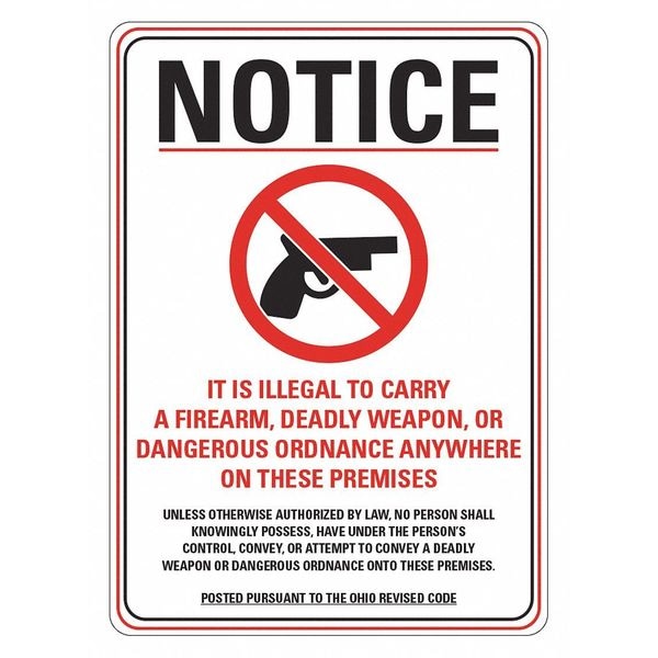 Security Sign, Vertical Rectangle, Number of Printed Sides 1, English, Sign Legend It Is Illegal To Carry A Firearm, Deadly Weapon, Or Dangerous Ordnance Anywhere On These Premises, Unless Otherwise Authorized By Law, No Person Shall Knowingly Possess, Have Under The Person's Control, Convey, Or Attempt To Convey A Deadly Weapon Or Dang, Sign Legend Background Color White, Sign Legend Style Symbol and Text