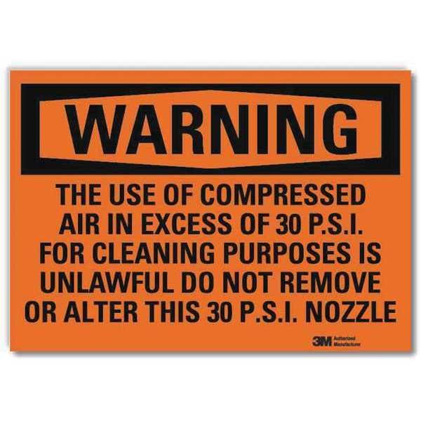 Security Sign, Horizontal Rectangle, Number of Printed Sides 1, English, Sign Format Traditional OSHA, Sign Legend The Use Of Compressed Air In Excess Of 30 P.S.I For Cleaning Purposes Is Unlawful Do Not Remove Or Alter This 30 P.S.I. Nozzle, Sign Legend Background Color Orange, Sign Legend Style Text