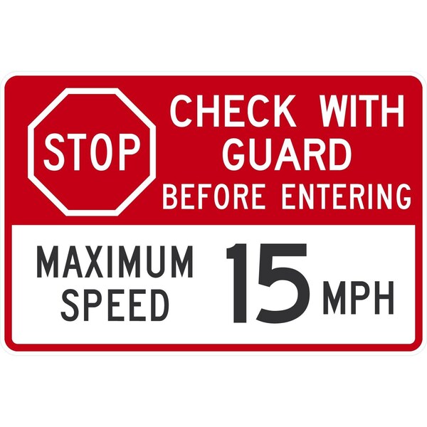 Stop Check With Guard Before Entering, Maximum Speed 15 MPH, 36x24, High Intensity Prismatic, White