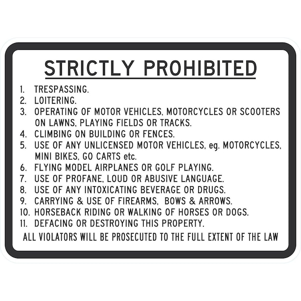 Strictly Prohibited Trespassing Loitering, 24x18, Engineer Grade, White