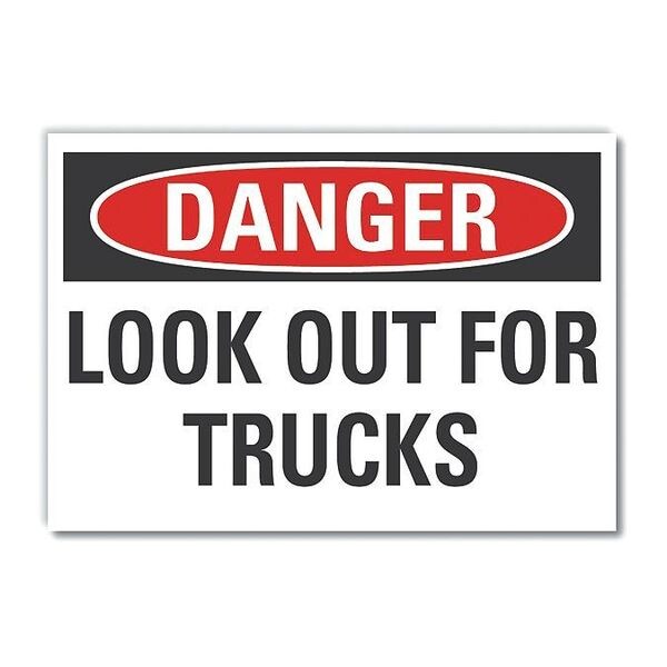 Traffic Safety Danger Label, Horizontal Rectangle, Number of Printed Sides 1, English, Sign Format Traditional OSHA, Sign Legend Look Out For Trucks, Sign Legend Background Color White, Sign Legend Style Text
