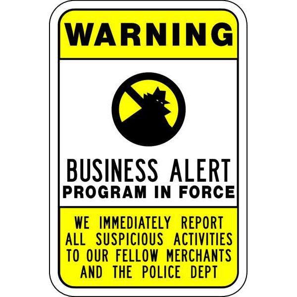 Traffic Sign, Vertical Rectangle, Number of Printed Sides 1, English, Sign Legend Business Alert Program In Force We Immediately Report All Suspicious Activities To Our Fellow Merchants And The Police Dept, Sign Legend Background Color White, Yellow, Sign Legend Style Symbol and Text
