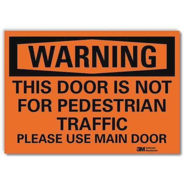 Warning Sign, Vertical Rectangle, Number of Printed Sides 1, English, Sign Legend This Door Is Not For Pedestrian Traffic Please Use Main Door, Sign Legend Background Color Orange, Sign Legend Style Text