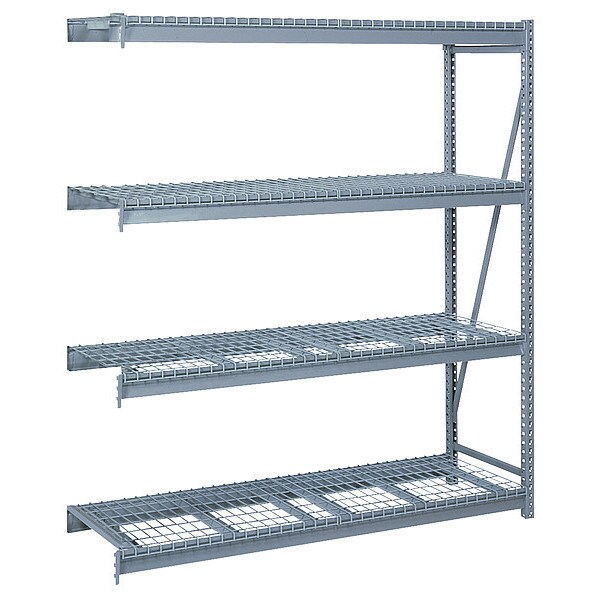 Bulk Storage Rack, Shelving Type Add-On, Overall Width 96 in, Overall Depth 24 in, Overall Height 96 in, Decking Material Steel, No. of Shelves 4, Shelf Capacity 1,650 lb, Load Capacity 10,000 lb, Shelving Frame Material Steel, Dove Gray, Finish - Shelving and Racks Powder Coated, Shelf Adjustments 1 1/2 in, Shelving Gauge 14, Shelving Post Gauge 14, Standards Greenguard Gold Certified, Includes (4) Front to Back Support Per Level, (8) Beams, Flat Wire Decking, Welded Uprights