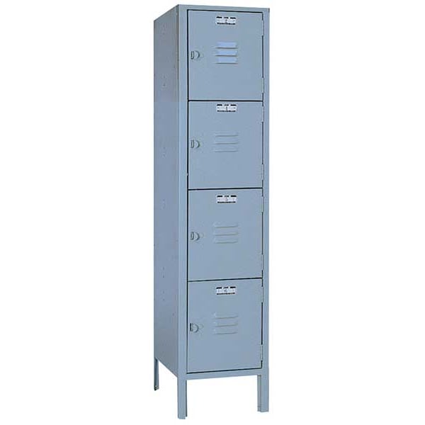 Box Locker, Audit Trail Storage None, Frame Assembled Assembled, Number of Tiers 4, Number of Units Wide 1, Door Type Louvered, Frame Material Thickness 16 ga, Includes Number Plates Yes, Locker Color Gray, Lock Type Padlock Hasp, Overall Depth 12 in, Overall Height 54 in, Overall Width 12 in, Base/Leg Height 6 in, Handle Type Pull, Includes 6 in Leg, Louvered Door and Pull Handle, Locker Material Steel, Number of Lockers 4, Opening Depth 10 7/8 in, Opening Height 10 5/8 in