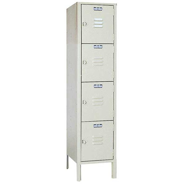 Box Locker, Audit Trail Storage None, Frame Assembled Assembled, Number of Tiers 4, Number of Units Wide 1, Door Type Louvered, Locker Color Tan, Lock Type Padlock Hasp, Overall Depth 12 in, Overall Height 54 in, Overall Width 12 in, Base/Leg Height 6 in, Handle Type Pull, Includes 6 in Leg, Louvered Door and Pull Handle, Locker Material Steel, Number of Lockers 4, Opening Depth 10 7/8 in, Opening Height 10 5/8 in, Opening Width 9 1/4 in