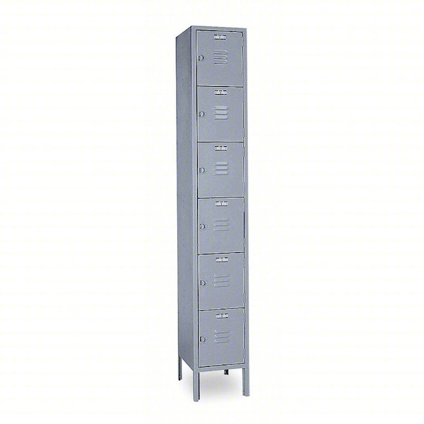 Box Locker, Audit Trail Storage None, Frame Assembled Unassembled, Number of Tiers 6, Number of Units Wide 1, Door Type Louvered, Locker Color Gray, Lock Type Padlock Hasp, Overall Depth 12 in, Overall Height 78 in, Overall Width 12 in, Base/Leg Height 6 in, Handle Type Pull, Includes 6 in Leg, Louvered Door and Pull Handle, Locker Material Steel, Number of Lockers 6, Opening Depth 10 7/8 in, Opening Height 10 5/8 in, Opening Width 9 1/4 in