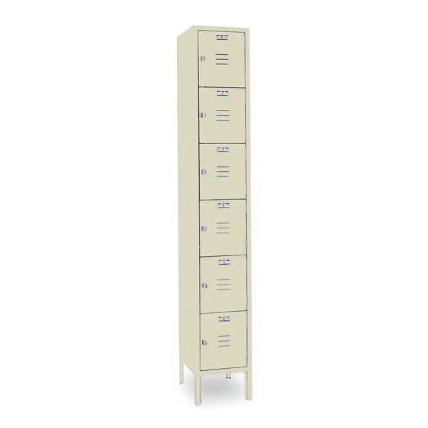 Box Locker, Audit Trail Storage None, Frame Assembled Assembled, Number of Tiers 6, Number of Units Wide 1, Door Type Louvered, Locker Color Tan, Lock Type Padlock Hasp, Overall Depth 18 in, Overall Height 78 in, Overall Width 12 in, Base/Leg Height 6 in, Handle Type Pull, Includes 6 in Leg, Louvered Door and Pull Handle, Locker Material Steel, Number of Lockers 6, Opening Depth 16 7/8 in, Opening Height 10 5/8 in, Opening Width 9 1/4 in