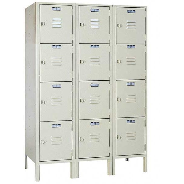 Box Locker, Audit Trail Storage None, Frame Assembled Assembled, Number of Tiers 4, Number of Units Wide 3, Door Type Louvered, Locker Color Tan, Lock Type Padlock Hasp, Overall Depth 12 in, Overall Height 54 in, Overall Width 36 in, Base/Leg Height 6 in, Handle Type Pull, Includes 6 in Leg, Louvered Door and Pull Handle, Locker Material Steel, Number of Lockers 12, Opening Depth 10 7/8 in, Opening Height 10 5/8 in, Opening Width 9 1/4 in