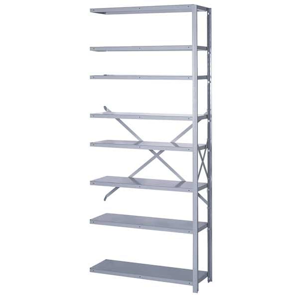 Metal Shelving, Gray, Powder Coated, Frame Material Steel, Load Capacity per Shelf 1,150 lb, Whole Unit Load Capacity 9,200 lb, Number of Shelves 8, Overall Depth 12 in, Overall Height 84 in, Overall Width 36 in, Shelf Configuration Add-On, Shelf Style Solid, Shelving Material Steel, Assembled Unassembled, Shelving Gauge 18 ga, Post Gauge 16 ga, Shelf Adjustment Increments 1 1/2 in, Number of Drawers 0, Duty Rating Heavy-Duty, Includes Back Brace, Upright Assembly