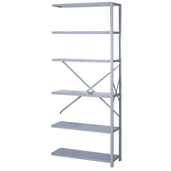 Metal Shelving, Gray, Powder Coated, Frame Material Steel, Load Capacity per Shelf 1,300 lb, Whole Unit Load Capacity 7,800 lb, Number of Shelves 6, Overall Depth 24 in, Overall Height 84 in, Overall Width 36 in, Shelf Configuration Add-On, Shelf Style Solid, Shelving Material Steel, Assembled Unassembled, Shelving Gauge 18 ga, Post Gauge 16 ga, Shelf Adjustment Increments 1 1/2 in, Number of Drawers 0, Duty Rating Heavy-Duty, Includes Back Brace, Upright Assembly