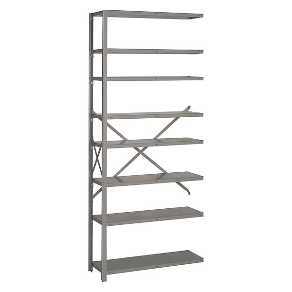 Metal Shelving, Gray, Overall Depth 18 in, Overall Height 84 in, Overall Width 36 in, Shelf Style Solid, Shelving Material Steel, Shelving Gauge 20, Includes (2) Welded Uprights, (8) Shelves, Back Panels, Shelf Clips