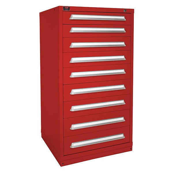 Modular Drawer Cabinet, Base Type Frame, Cabinet Color Red, Cabinet Storage Components Drawers, Number of Compartments per Drawer (1) 8, (2) 12, (3) 16, (2) 20, (1) 24, Number of Drawers 9, Overall Depth 28 1/4 in, Overall Height 59 1/4 in, Overall Width 30 in, Mobility Stationary, Number of Compartments 144, Cabinet Finish Powder Coated, Cabinet Material Steel, Drawer Access Multiple, Drawer Handle Type Pull, Drawer Inside Height (2) 3 7/8 in, (2) 4 5/8 in, (2) 6 1/4 in, (3) 5 3/8 in