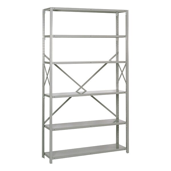 Steel, Clip Adjustable Shelving, Gray, Powder Coated, Frame Material Steel, Load Capacity per Shelf 750 lb, Whole Unit Load Capacity 4,500 lb, Number of Shelves 6, Overall Depth 12 in, Overall Height 84 in, Overall Width 48 in, Post Construction Angle, Shelf Configuration Starter, Shelf Style Solid, Shelving Material Steel, Assembled Partially Assembled, Shelving Gauge 18 ga, Post Gauge 16 ga, Shelf Adjustment Increments 1 1/2 in, Mounting Type Bolts, Mounting Hardware Required Yes