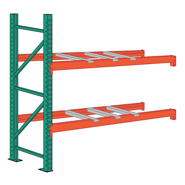 Pallet Rack Add-On Unit, Beam Height 4 1/8 in, Beam Step Depth 1 in, Step Beam Beam Style, 14 ga, Overall Depth 48 in, Overall Height 8 ft, Overall Width 108 in, Load Capacity per Shelf 5,200 lb, Add-On Pallet Rack Configuration, 14 ga, Upright Load Capacity @ 36 in 20,600 lb, Whole Unit Load Capacity 10,400 lb, Usable Width 8 ft, Orange/Green, Teardrop Connection Type, Powder Coated, Upright, (4) Beams, Front to Back Supports, Steel, Roll Formed Metal Forming Type, Number of Shelves 2