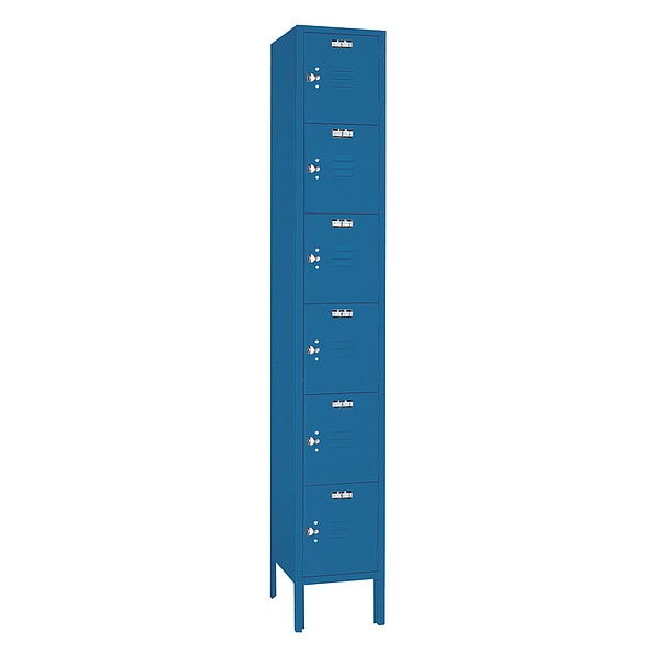 Wardrobe Locker, Audit Trail Storage None, Frame Assembled Assembled, Number of Tiers 6, Number of Units Wide 1, Door Type Louvered, Includes Number Plates No, Locker Color Blue, Lock Type Padlock Hasp, Overall Depth 12 in, Overall Height 78 in, Overall Width 12 in, Handle Type Pull, Locker Finish Powder Coated, Locker Material Steel, Number of Lockers 6, Opening Height 12 in, Opening Width 12 in