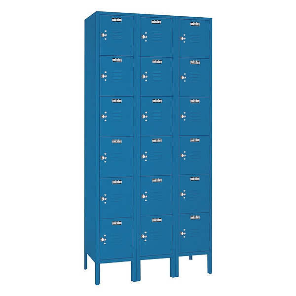 Wardrobe Locker, Audit Trail Storage None, Frame Assembled Unassembled, Number of Tiers 6, Number of Units Wide 3, Door Type Louvered, Includes Number Plates No, Locker Color Blue, Lock Type Padlock Hasp, Overall Depth 12 in, Overall Height 78 in, Overall Width 36 in, Handle Type Pull, Locker Finish Powder Coated, Locker Material Steel, Number of Lockers 18, Opening Height 12 in, Opening Width 12 in