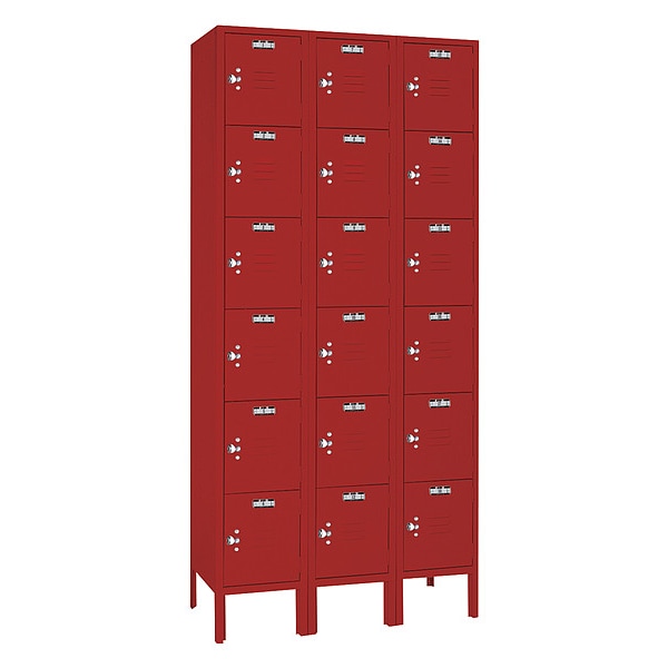Wardrobe Locker, Audit Trail Storage None, Frame Assembled Assembled, Number of Tiers 6, Number of Units Wide 3, Door Type Louvered, Includes Number Plates No, Locker Color Red, Lock Type Padlock Hasp, Overall Depth 12 in, Overall Height 78 in, Overall Width 36 in, Handle Type Pull, Locker Finish Powder Coated, Locker Material Steel, Number of Lockers 18, Opening Height 12 in, Opening Width 12 in