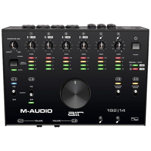 Conquer any recording session with professional studio quality and features!8-in 4-out feature-packed USB audio/MIDI interface that provides all of the connections and software you need to easily create professional 24-bit/192kHz studio-quality recordings. Features 4 XLR+1/4-in TRS combo inputs, 2 1/4-in line inputs and 2 1/4-in instrument inputs that have a specially designed gain and impedance stage to provide the most accurate representation of your guitar or bass when plugged directly into the interface. There is also MIDI input and output connections so you can connect any external midi gear that you may have such as external sequencers, drum machines and controllers. 24-bit/192kHz resolution for professional recording and monitoring Hi-Speed USB circuitry for fastest connection, with class-leading round-trip latency of 2.59ms Transparent Crystal preamps and ultra-pristine A/D converters for unsurpassed audio recording quality VU LED meters for dialing in the perfect level 4 XLR+1/4-in TRS combo inputs, 2 1/4-in instrument inputs and 2 1/4-in line inputs MIDI input/output for connecting virtually any external MIDI gear Stereo 1/4-in with direct mono/stereo switch; 2 1/4-in assignable auxiliary outs 2 1/4-in headphone outputs with independent source and level controls Rugged metal chassis; large central control for easy volume adjustment USB/Direct knob for balancing between the input signal and the computer signal Round trip latency is dependent on buffer settings, and computer hardwareincluded AIR 192-14 USB-C-to-USB-C Cable USB-C-to-USB-A Cable 2 1/8-in 3.5 mm to MIDI AdaptersMinimum System RequirementsStandard USB 2.0 or USB-C PortWindows: 7 32 or 64 bitOSX: 10.8Mic Inputs 1-4 balanced XLR FREQUENCY RESPONSE 20 Hz - 20 kHz +/-0.2 dB DYNAMIC RANGE 113 dB A-weighted THD+N 0.003% PREAMP EIN -137 dBu 40 O source, A-weighted -129 dBu 150 O source, unweighted MAX INPUT LEVEL +14 dBu GAIN RANGE 62 dB Line Inputs 1-4 balanced 1/4-in 6.35 mm TRS FREQUENCY RESPONSE 20 Hz - 20 kHz +/-0.1 dB DYNAMIC RANGE 113 dB A-weighted THD+N 0.001% 1 kHz, +4 dBu, -1 dBFS MAX INPUT LEVEL +30 dBu GAIN RANGE 61 dB Inst Inputs 5-6 unbalanced 1/4-in 6.35 mm TS FREQUENCY RESPONSE 20 Hz - 20 kHz +/-0.1 dB DYNAMIC RANGE 110 dB A-weighted THD+N 0.001% 1 kHz, +4 dBu, -1 dBFS MAX INPUT LEVEL +16 dBu INPUT IMPEDANCE 1 MO GAIN RANGE 59 dB Fixed Line Inp
