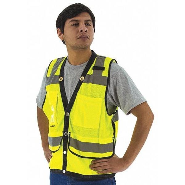 High Visibility Vest, ANSI Class 2, Vest Size L, Traffic Safety Vest Color Yellow/Green, Fits Chest Size 52 in, Gender Men's, Stripe Color Silver, Vest Material Polyester, Vest Closure Type Snap, Features All Fabric Edges are Reinforced With Heavy Trim, Fabric is Designed for Tough Duty and Long Lasting Wear, ID Window, Standards ANSI/ISEA 107