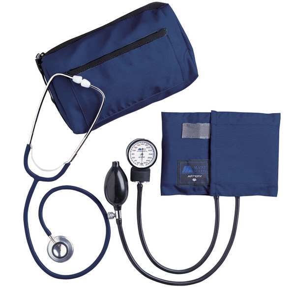 Aneroid Sphygmomanometer/Dual Head StethoscopeMaterial Nylon Cuff, Latex, Color NavySize AdultLength 3 In., Width 6-3/16 In., Height 9-13/16 In., Weight 1.2 lb., NoProvides Blood Pressure Reading, BoxIncludes Aneroid Sphygmomanometer, Calibrated Nylon Cuff, Dual Head Stethoscope, Binaural, Lightweight Anodized Aluminum Chest Piece, 22 In. Vinyl Y-Tubing, Spare Diaphragm, Pair of Mushroom Eartips