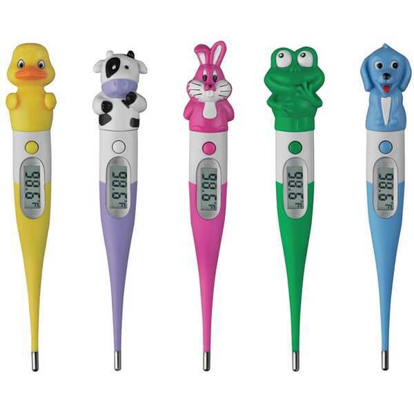 Digital Thermometer, Thermometer Location Oral, Readout Time 20 sec, Color Blue, Green, Pink, Purple, Yellow, Material ABS, TPE, Length 2 1/8 in, Width 6 11/16 in, Height 1 5/16 in, Standards ASTM E1112, Includes (2) LR1130 Replacement Batteries, (5) Probe Covers, Bella Bunny, Carlos Cow, Daniela Duck, Frieda Frog, Half Storage Cases, Instructions, Pedro Puppy