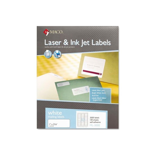 Maco white all-purpose labels, 1 x 2-5/8, 3000/box create quality labels at your desk. Acid-free and lignin-free. Ideal for bulk mailings and identification. Features permanent adhesive. Won't jam in laser or inkjet printers. Compatible with most popular label software programs. Label size - text: 1 x 2 5/8; label color(s): white; machine compatibility: inkjet printers; laser printers; adhesive: permanent self-adhesive. larger quantity quotes available. Please call 1-888-978-7759. this product arrives to most customers in 2-3 business days.