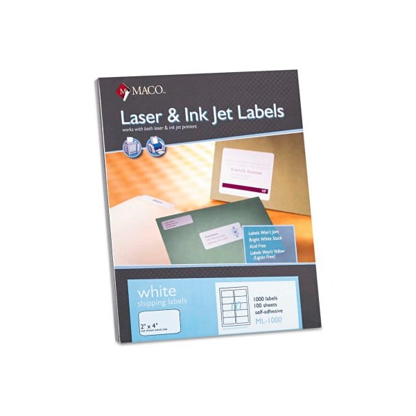 Maco white all-purpose labels, 2 x 4, 1000/box create quality labels at your desk. Acid-free and lignin-free. Ideal for bulk mailings and identification. Features permanent adhesive. Won't jam in laser or inkjet printers. Compatible with most popular label software programs. Label size - text: 2 x 4; label color(s): white; machine compatibility: inkjet printers; laser printers; adhesive: permanent self-adhesive. larger quantity quotes available. Please call 1-888-978-7759. this product arrives to most customers in 2-3 business days.