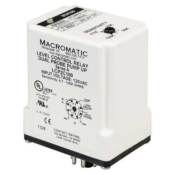 Level Control Relay, Base Shape Octal, Contact Form SPDT, Current Rating 10 A, Electrical Connection 8-Pin Terminal, Flat Pin Width Not Applicable, Input Voltage 120V AC, Minimum Resistance Sensitivity 4,700 ohm, Maximum Resistance Sensitivity 100,000 ohm, Number of Pins 8, Number of Probes Dual Probe, Relay Function Pump Down, Contact Rating (AC) 10 A @ 240V AC, Contact Rating (DC) 7 A @ 28V DC, Mounting Style Socket, Status Indicator LED Indicator, Body Depth 2.8 in, Body Height 3.2 in