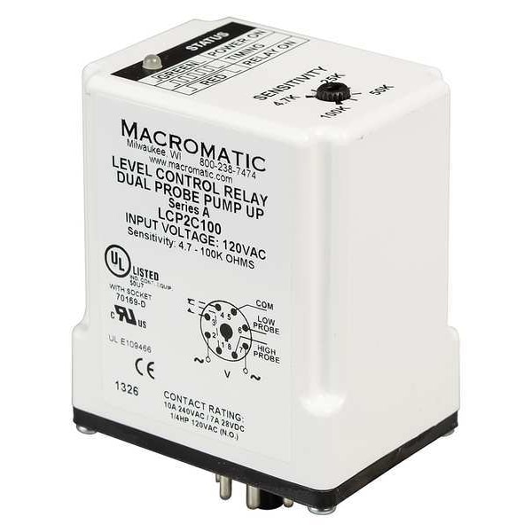 Level Control Relay, Base Shape Octal, Contact Form SPDT, Current Rating 10 A, Electrical Connection 8-Pin Terminal, Flat Pin Width Not Applicable, Input Voltage 120V AC, Minimum Resistance Sensitivity 4,700 ohm, Maximum Resistance Sensitivity 100,000 ohm, Number of Pins 8, Number of Probes Dual Probe, Relay Function Pump Up, Contact Rating (AC) 10 A @ 240V AC, Contact Rating (DC) 7 A @ 28V DC, Mounting Style Socket, Status Indicator LED Indicator, Body Depth 2.8 in, Body Height 3.2 in