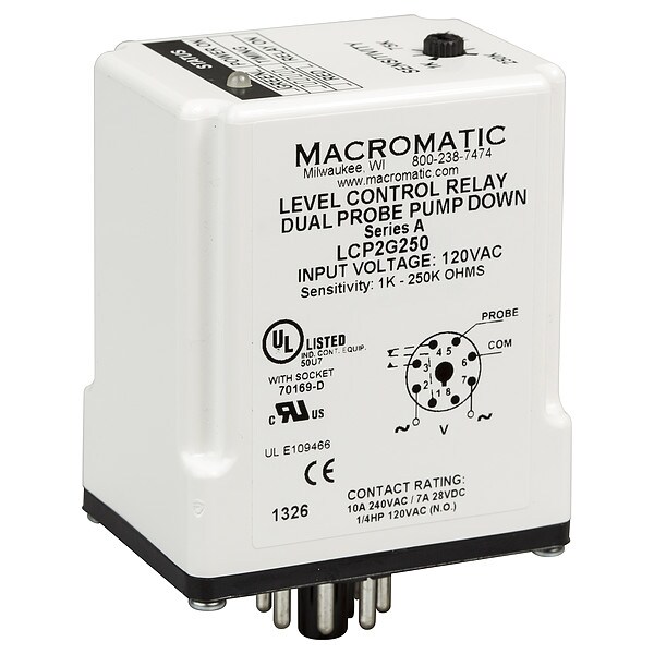 Liquid Level Relay, Base Shape Octal, Contact Form SPDT, Current Rating 10 A, Electrical Connection 8-Pin Terminal, Flat Pin Width Not Applicable, Input Voltage 120V AC, Minimum Resistance Sensitivity 1,000 ohm, Maximum Resistance Sensitivity 250,000 ohm, Number of Pins 8, Number of Probes Dual Probe, Relay Function Pump Down, Contact Rating (AC) 10 A @ 240V AC, Contact Rating (DC) 7 A @ 28V DC, Mounting Style Socket