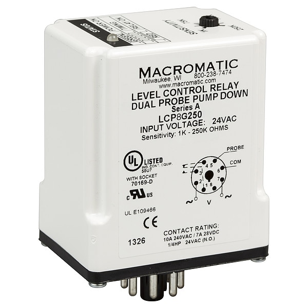 Liquid Level Relay, Base Shape Octal, Contact Form SPDT, Current Rating 10 A, Electrical Connection 8-Pin Terminal, Flat Pin Width Not Applicable, Input Voltage 24V AC, Minimum Resistance Sensitivity 1,000 ohm, Maximum Resistance Sensitivity 250,000 ohm, Number of Pins 8, Number of Probes Dual Probe, Relay Function Pump Down, Contact Rating (AC) 10 A @ 240V AC, Contact Rating (DC) 7 A @ 28V DC, Mounting Style Socket