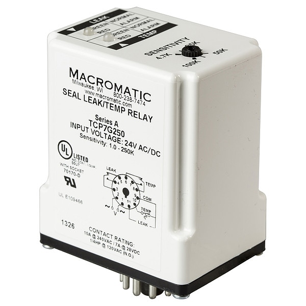 Seal/Temp Relay, Contact Form SPDT, Current Rating 7 A, Electrical Connection 11-Pin Terminal, Input Voltage 24V AC/DC, Number of Channels Single Channel, Number of Pins 11, Relay Function Over Temperature, Seal Leakage, Seal Leak Minimum Resistance 1,000 ohm, Seal Leak Maximum Resistance 250,000 ohm, Status Indicator LED Indicator, Contact Rating (AC) 7 A @ 240V, Contact Rating (DC) 7 A @ 28V, Mounting Style Plug-In, Adjustment Method Rotary Knob, Base Shape Octal, Body Depth 2.9 in