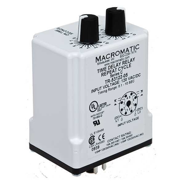 Single Function Time Delay Relay, Adjustment Method Potentiometer, Base Shape Octal, Coil Voltage 24V AC/DC, Contact Form DPDT, Contact Rating (AC) 10 A @ 240V, Contact Rating (DC) 10 A @ 30V, Current Rating 10 A, Number of Delay Functions 1, Delay Function Cycle On, Electrical Connection Socket, Flat Pin Width Not Applicable, IP Rating IP20, Input Voltage 24V AC/DC, Minimum Time Setting 1.8 sec, Maximum Time Setting 3 min, Number of Pins 8, Sealing Enclosed, Mounting Style Plug-In