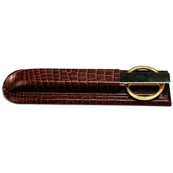 A beautiful and unique accent for your desktop! This library set includes a letter opener and a pair of scissors housed in a gorgeous top-grain leather holder unit. The leather is finished in a rich crocodile embossed pattern for a distinctive and high-end look. To protect furniture surfaces the holder has a soft felt bottom. This is a great functional accessory for your desktop, and a wonderful gift for the executive that has everything!Length: 10.5 Height: 1.25 Width: 3.75