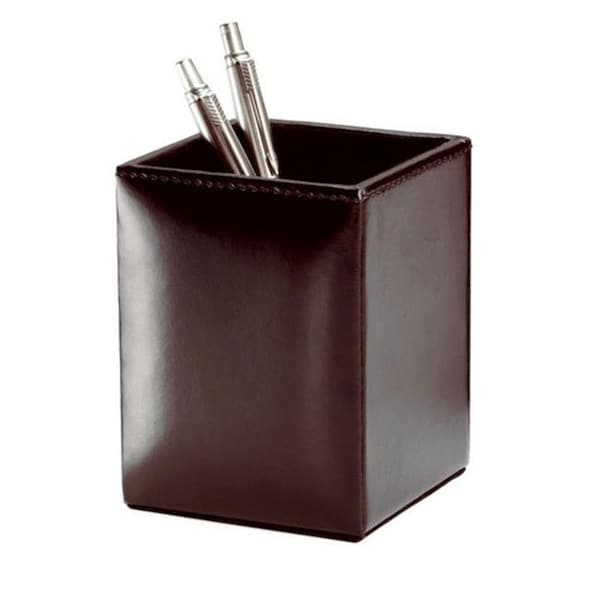 Take your desk to the next level with this classic leather pencil cup! Crafted with a cost-effective bonded leather, these pencil cups are the best value for a quality leather desk accessories. The felt interior lining makes sure your desktop won't be scratched, and the padded interior compartment is designed to protect the writing points of your pens and pencils. Clean up your desk and make a workplace style statement with this pencil cup!Length: 3 Height: 4 Width: 3