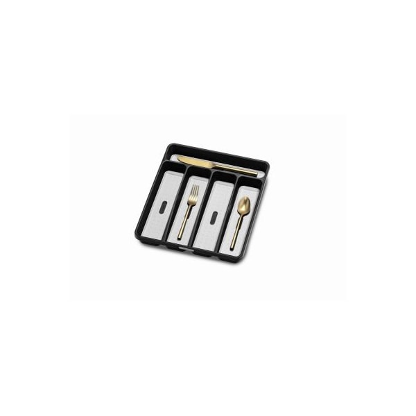 The Classic Small Silverware Tray 5 Compartments helps you organize silverware in this five-compartment tray designed to fit small drawers. Features rounded corners for easy cleaning soft-grip lining and non-slip rubber feet to keep things in place. Made from high-quality BPA-free plastic.