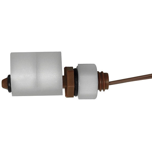 Closed Liquid Level Switch, Switch Function Selectable, Side Mounting, Tank Connection Size 3/8 in - 16 UNC, Max. Pressure 50 psi, VA Rating 15, Operating Temp. Range 221 Degrees F Max., Overall Length 1.85 in, Float Material Polypropylene, Float Length 0.63 in, Float Dia. 0.58 in, Stem Material Polypropylene, Stem Length 1.24 in, Height 1.85 in, Width 0.78 in, Contact Form SPST, Max. Current 0.12 A, Max. Voltage 240 V, Body Material Polypropylene, Conduit Size 3/8 in 16