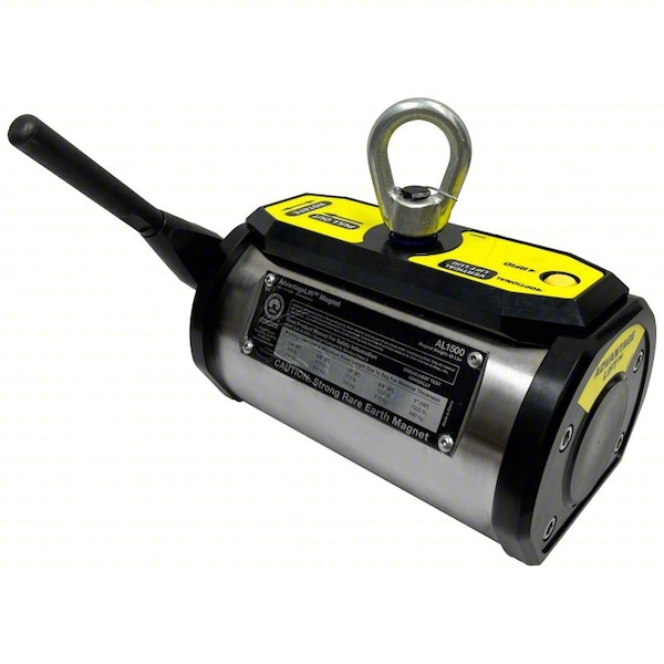 Lifting Magnet, Maximum Flat Load Capacity 1,600 lb, Maximum Round Load Capacity 800 lb, Minimum Thickness for Activation 1/4 in, Minimum Thickness for Maximum Load Capacity 1/4 in, Activation Mechanism On/Off Handle, Magnet Length 9 1/4 in, Magnet Width 4 3/8 in, Magnet Height 6 in, Overall Length 13 3/8 in, Overall Width 6 7/8 in, Overall Height 10 in, Bail Inside Width 1 3/4 in, Bail Inside Length 2 1/4 in, Handle Length 11 1/2 in, Minimum Operating Temperature -10 Degrees F