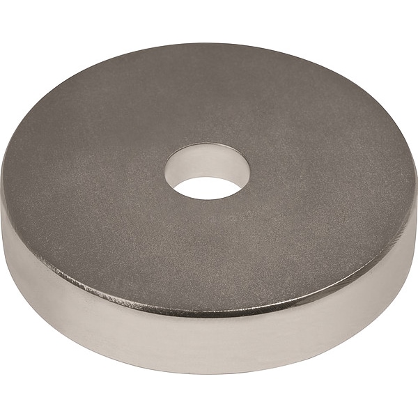 Rare Earth Magnet Material, Material Neodymium Iron Boron, Casing Material Sintered, Max. Pull 36.85 lb., Thickness 0.125 In., Diameter 1.00 In., Hole Dia. 0.187 In., Stability Temp. 180 Degrees F