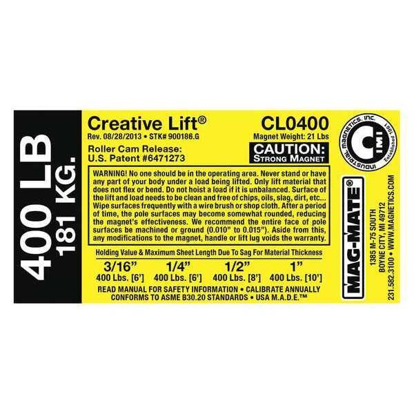 Replacement Capacity Sticker, Product Type Capacity Sticker, Compatible Product Type Below-the-Hook Lifting Magnets, Compatible Grainger Part Number 2RUZ6, Compatible Manufacturer Model Number CL0400