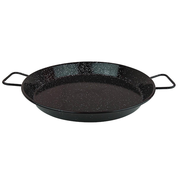 The Traditional Spanish paella pan is excellent for cooking Mediterranean style rice: loose grain and thin layer. Made of enameled steel with black and white speckled enamel in the interior and exterior makes this paella pan extremely durable and very easy to clean. The wide and shallow pan ensures rice cooks in a thin layer. Its size is perfect for 2-4 servings. Suitable for gas charcoal and electric stoves. This pan is dishwasher safe but hand wash recommended for a longer life.It includes instructions manual and recipe book allowing you to make the most popular Spanish paella. Features -12 in. Paella Pan -2 - 4 Servings pan -Enameled steel with black and white speckled enamel -Dishwasher safe but hand wash recommended for a longer life Specifications - Dimension: 14L x 3H x 14w - Weight: 2 lbs