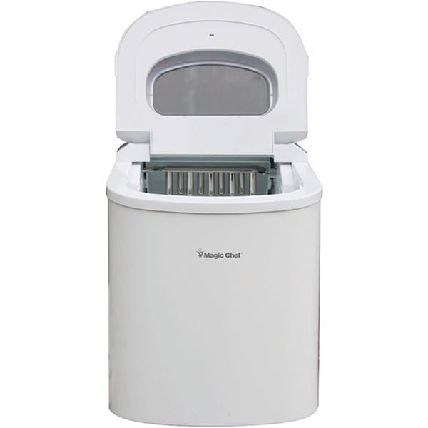 The Magic Chef 27 lb. Ice Maker can make up to 27 lbs. of ice per day to help provide you with a steady ice supply. It is just what you need to continuously fill your ice bucket or beverage pitchers when you are entertaining friends and family. The ice maker can conveniently hold up to 1.5 lbs. of ice at a time and the digital control panel indicates when the storage bin needs to be emptied. The ice maker produces ice in 2 sizes in as little as 7 minutes and features a compact design that helps make it easily portable. Features -Portable mini ice maker -Makes ice in as little as 7 min -Makes 9 ice cubes per cycle -Choice of 2 ice cube sizes -Makes up to 27lbs of ice in 24 hours -Compact countertop size -Exterior drain -See-through window -Easy-touch control pad with indicator lights -Removable ice basket with handy ice scooper -Indicator lights for ice & water levels -White Specifications - Color: White - Includes: Ice maker ice scoop and manual - Battery Information: Product does not require a battery - Marketing Color: White - Weight: 22.5 lbs