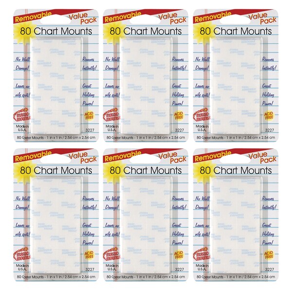 Our revolutionary adhesive bonding system secures tightly to most surfaces including drywall, painted block, brick, glass, tile, paneling and most other wall surfaces. And as one of the "original" removable adhesives, it removes cleanly with no residue, oily spots, or marring of walls... guaranteed! These wall savers get an "A." Teacher tested and preferred, this remarkable removable adhesive holds securely and removes cleanly up to 2 years. Removable Chart Mounting Tabs 1"x1". Each pack contains 80 chart mounts. Sold as a set of 3 packs, 240 chart mounts total.